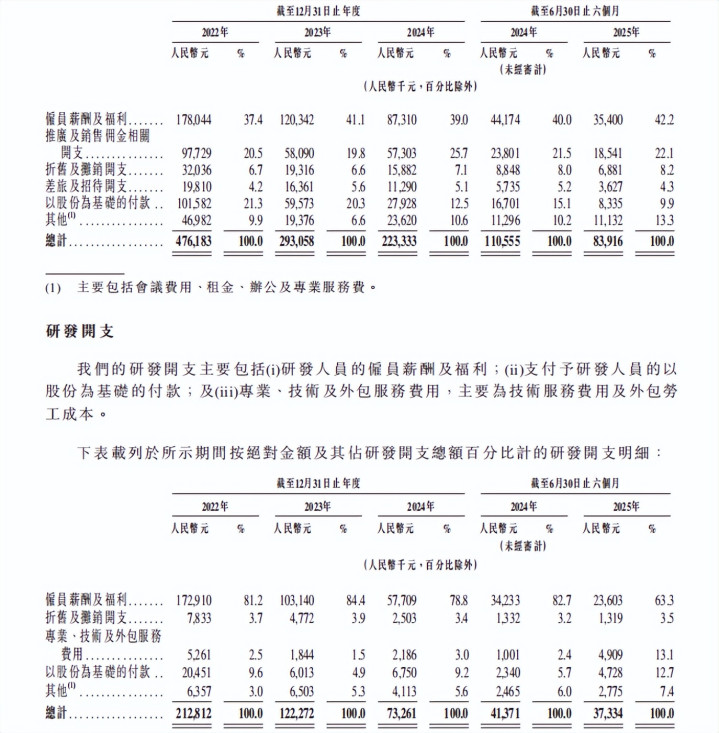 与此同时,微医控股普通员工的薪酬一降再降。2022年,微医控股销售人员的薪酬及福利为1.78亿元,2024年降至8731万,今年上半年只剩3540万,同比下降19.86%;研发人员薪酬及福利从2024年的1.73亿元降至2024年的5770.9万元,今年上半年同比下降31.05%至2360.3万元。