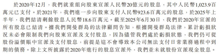 尽管连年亏损,微医控股却没有忘记向股东派息。招股书显示,微医控股于2020年12月就重组向股东宣派人民币20亿元的股息,并在2025年上半年结清。招股书还强调,尽管处于亏损状态,微医控股仍可从股份溢价账中宣派及支付股息,前提是这不会导致无法支付日常业务过程中到期的债务。