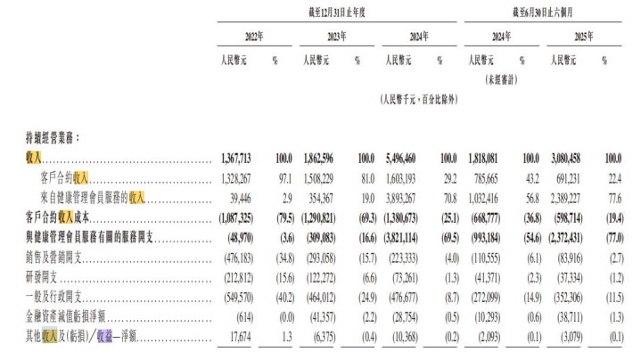招股书显示,微医控股2022年、2023年、2024年及2025年上半年持续经营业务的亏损额分别为37.82亿元、14.01亿元、16.37亿元、6.75亿元,3年半一共亏损74.95亿元。即便是经调整后亏损,在2025年上半年也达到了1.3亿元。